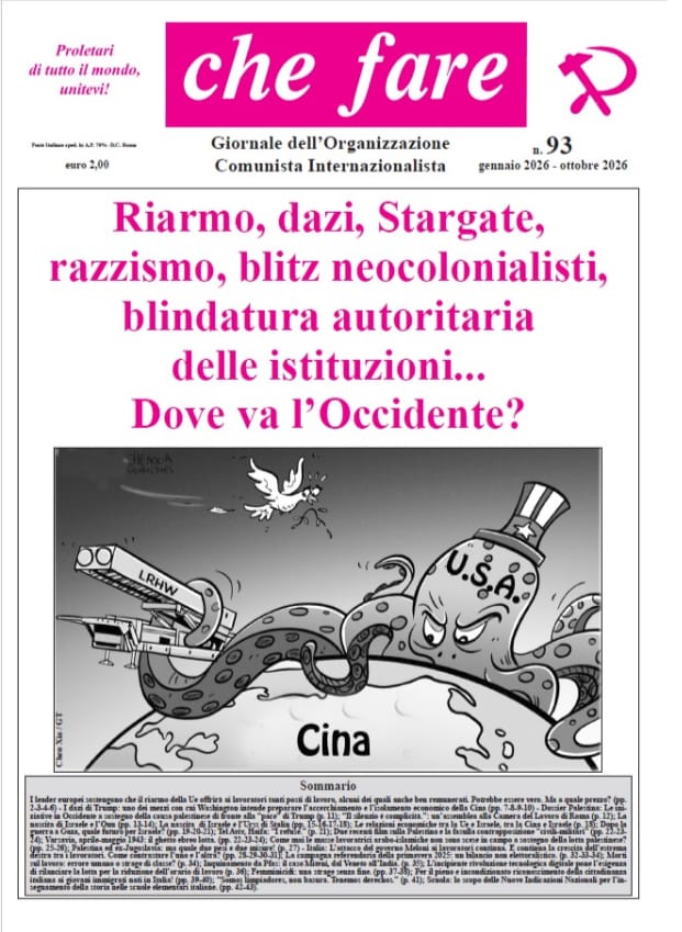 I leader europei sostengono che il riarmo della Ue offrirà ai lavoratori tanti posti di lavoro, alcuni dei quali anche ben remunerati. Potrebbe essere vero. Ma a quale prezzo? (pp. 2-3-4-6) – I dazi di Trump: uno dei mezzi con cui Washington intende preparare l’accerchiamento e l’isolamento economico della Cina (pp. 7-8-9-10) - Dossier Palestina: Le iniziative in Occidente a sostegno della causa palestinese di fronte alla “pace” di Trump (p. 11). “Il silenzio è complicità.”: un’assemblea alla Camera del Lavoro di Roma (p. 12). La nascita di Israele e l’Onu (pp. 13-14). La nascita di Israele e l’Urss di Stalin (pp. 15-16-17-18). Le relazioni economiche tra la Ue e Israele, tra la Cina e Israele (p. 18); Dopo la guerra a Gaza, quale futuro per Israele? (pp. 19-20-21). Tel Aviv, Haifa: “I refuse.” (p. 21). Due recenti film sulla Palestina e la fasulla contrapposizione “civili-militari” (pp. 22-23-24). Varsavia, aprile-maggio 1943: il ghetto ebreo lotta (pp. 22-23-24). Come mai le masse lavoratrici arabo-islamiche non sono scese in campo a sostegno della lotta palestinese? (pp. 25-26). Palestina ed ex-Jugoslavia: ma quale due pesi e due misure! (p. 27) - Italia: L’attacco del governo Meloni ai lavoratori continua. E continua la crescita dell’estrema destra tra i lavoratori. Come contrastare l’uno e l’altra? (pp. 28-29-30-31). La campagna referendaria della primavera 2025: un bilancio non elettoralistico. (p. 32-33-34). Morti sul lavoro: errore umano o strage di classe? (p. 34). Inquinamento da Pfas: il caso Miteni, dal Veneto all’India (p. 35). L’incipiente rivoluzione tecnologica digitale pone l’esigenza di rilanciare la lotta per la riduzione dell’orario di lavoro (p. 36). Femminicidi: una strage senza fine. (pp. 37-38). Per il pieno e incondizionato riconoscimento della cittadinanza italiana ai giovani immigrati nati in Italia! (pp. 39-40). “Somos limpiadores, non basura. Tenemos derechos.” (p. 41). Scuola: lo scopo delle Nuove Indicazioni Nazionali per l’insegnamento della storia nelle scuole elementari italiane.